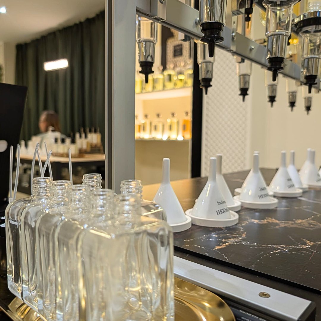 Each perfume is filled on the spot and delivered in an elegant bottle with a personalized label.